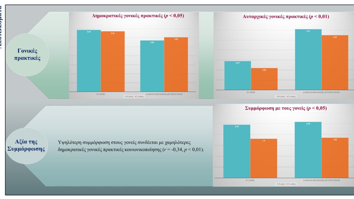 Η εσωτερίκευση των αξιών, ώστε η συμπεριφορά να είναι κοινωνικά αποδεκτή, αποτελεί στόχο της γονικής κοινωνικοποίησης. Οι πρακτικές ανατροφής που χρησιμοποιούνται από τους γονείς επηρεάζουν διαφορετικά την εσωτερίκευση των αξιών των παιδιών. Έχει σημειωθεί ότι η μετανάστευση δημιουργεί πιέσεις για τους μετανάστες γονείς. Η αντίθεση μεταξύ διαφορετικών πολιτισμικών πλαισίων (της χώρας προέλευσης και της χώρας υποδοχής) ενδέχεται να επιφέρει αποξένωση από τις κοινωνικές νόρμες του πολιτισμού καταγωγής. Η ιστορία ζωής (life history method) είναι μία ποιοτική μέθοδος βαθιάς περιγραφής της ζωής των ατόμων, κατάλληλη να μελετήσει τα παραπάνω ζητήματα. Στην παρούσα έρευνα, ποσοτικοποιώντας την ιστορία ζωής, δημιουργήσαμε ένα εργαλείο αναδρομικής αυτοαναφοράς, με το οποίο μελετήσαμε τις γονικές πρακτικές και τις επιδιωκόμενες αξίες σε δύο πολιτισμικές ομάδες ενηλίκων ελληνικής καταγωγής (n = 52) και αλβανικής καταγωγής δεύτερης γενιάς (n = 35). Οι συμμετέχοντες αξιολόγησαν τις πρακτικές των γονέων τους (δημοκρατικές, αυταρχικές) και τη συμμόρφωση, ως επιδιωκόμενη αξία των γονέων τους για τους ίδιους ως παιδιά. Τα αποτελέσματα έδειξαν ότι οι Έλληνες αξιολόγησαν τις δημοκρατικές πρακτικές των γονέων τους υψηλότερα, συγκριτικά με τους Αλβανούς μετανάστες δεύτερης γενιάς στην Ελλάδα. Αντίστοιχα, οι Αλβανοί μετανάστες δεύτερης γενιάς αξιολόγησαν πιο υψηλά τις αυταρχικές πρακτικές των γονέων τους. Αναφορικά με τη γονική αξία της συμμόρφωσης, οι Έλληνες την αξιολόγησαν λίγο χαμηλότερα συγκριτικά με τους αλβανικής καταγωγής συμμετέχοντες. Επιπλέον, υψηλότερος βαθμός υιοθέτησης της γονικής αξίας της συμμόρφωσης συνδέθηκε με χαμηλότερο βαθμό υιοθέτησης των γονικών δημοκρατικών πρακτικών και στις δύο ομάδες καταγωγής. Τα ευρήματα αυτά αναδεικνύουν τον ρόλο της γονικότητας στη διαγενεακή μεταβίβαση των αξιών σε ομάδες διαφορετικού κοινωνικοπολιτισμικού προφίλ.